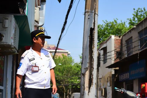 這根電線桿因何而開裂呢?巡查到此的未來路大街巡防隊員張根生說出了原委。